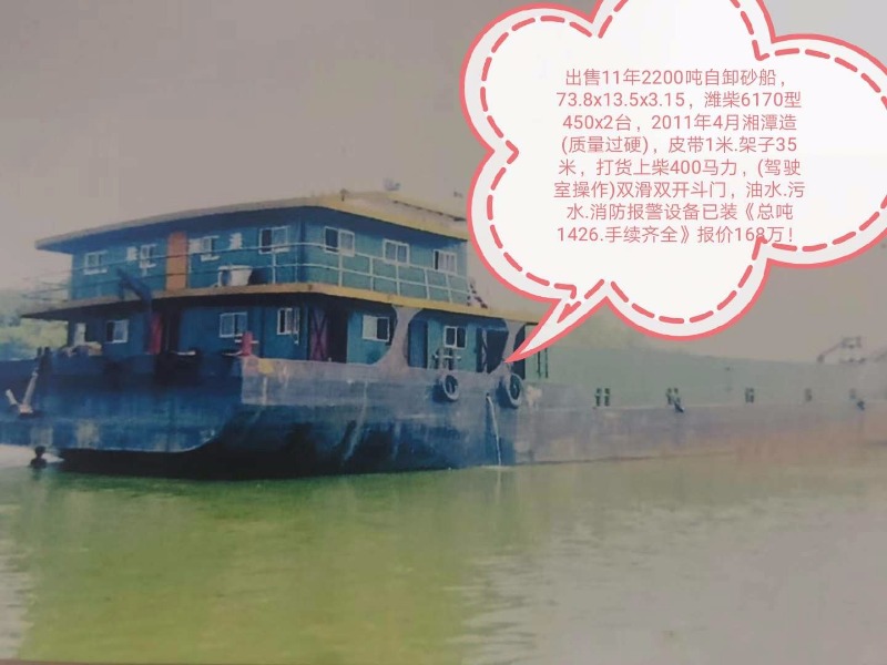出售11年2200吨自卸砂船,73.8x13.5x3.15,潍柴6170型450x2台,2011年4月湘潭造(质量过硬),皮带1米.架子35米,打货上柴400马力,(驾驶室操作)双滑双开斗门,油水.污水.消防报警设备已装《总吨1426.手续齐全》报价168万!