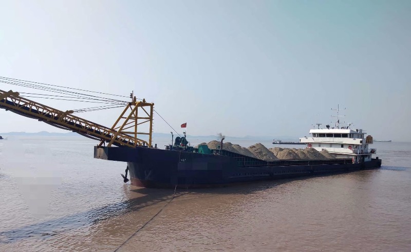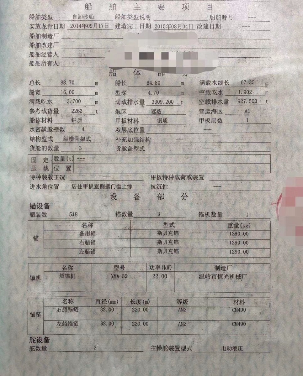 出售沿海遮蔽证书自卸沙船,2015年浙江造,实装3000吨,参考2260吨,长88.7米,宽16米,深4.6米,主机维柴8170x2台,输送带29米.宽1.4米。